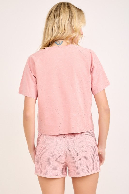 Rhinestone embellishment oversized short sleeves cropped cotton t-shirt